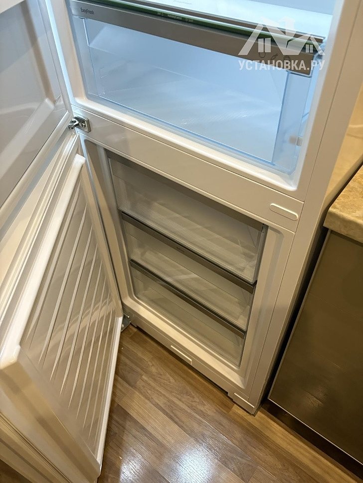 - Демонтаж либо установка нижней полки под холодильник. Для выставления холодильника по высоте.