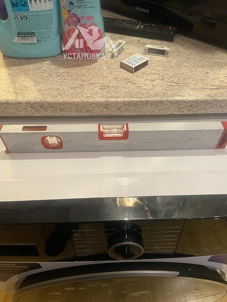 - Снятие транспортировочных креплений у стиральной машины, выравнивание по уровню.