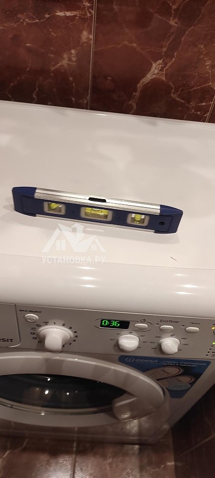 - Снятие транспортировочных креплений у стиральной машины, выравнивание по уровню.