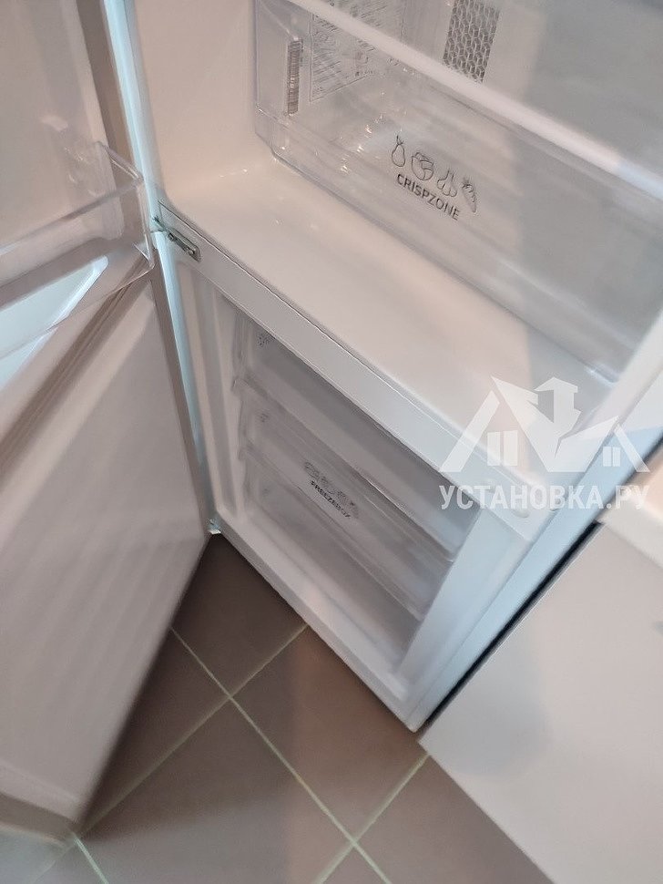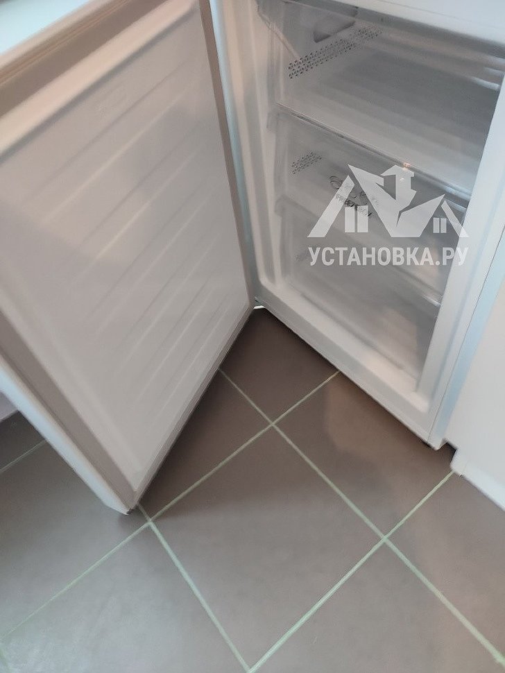 - Демонтаж либо установка нижней полки под холодильник. Для выставления холодильника по высоте.