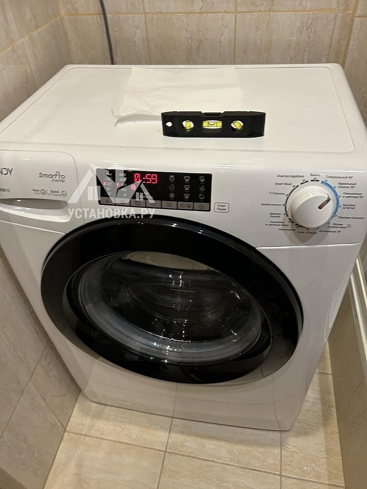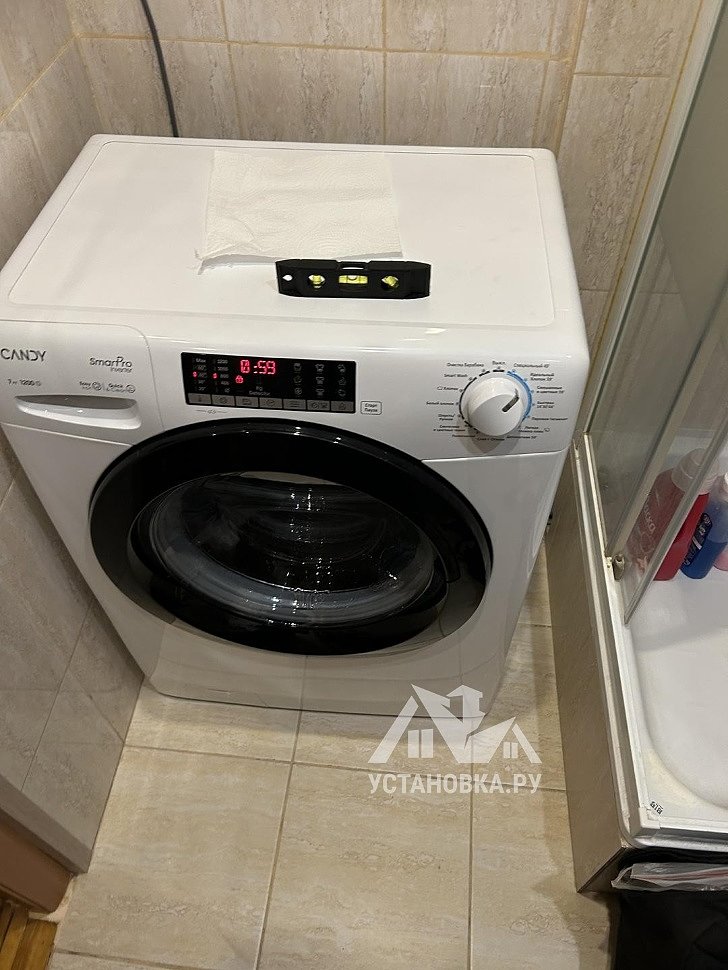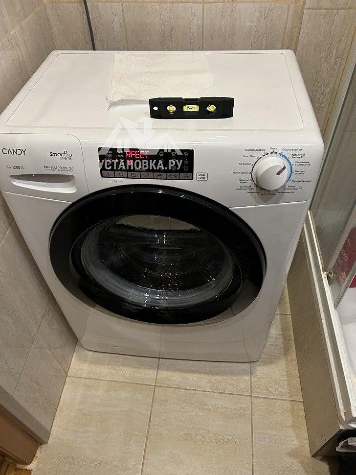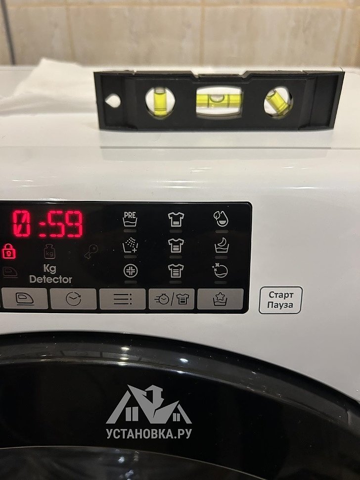 - Снятие транспортировочных креплений у стиральной машины, выравнивание по уровню.