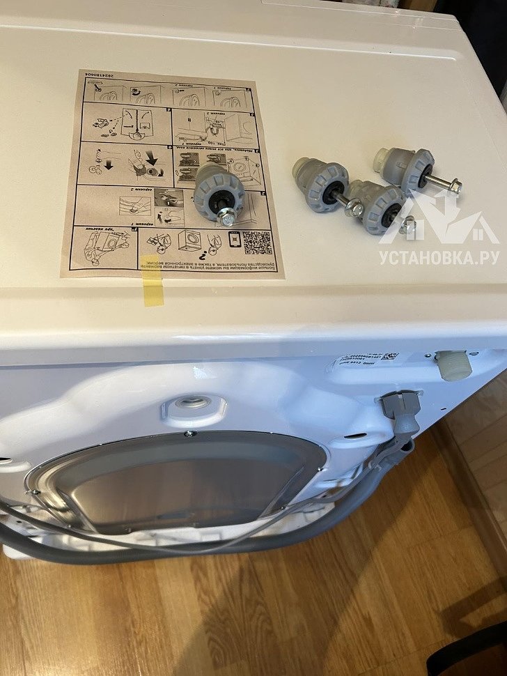 - Снятие транспортировочных креплений у стиральной машины, выравнивание по уровню.