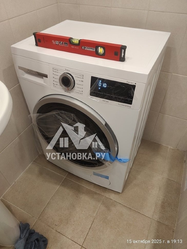 - Снятие транспортировочных креплений у стиральной машины, выравнивание по уровню.