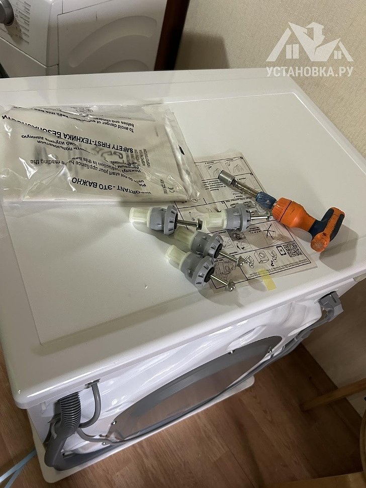 - Снятие транспортировочных креплений у стиральной машины, выравнивание по уровню.
