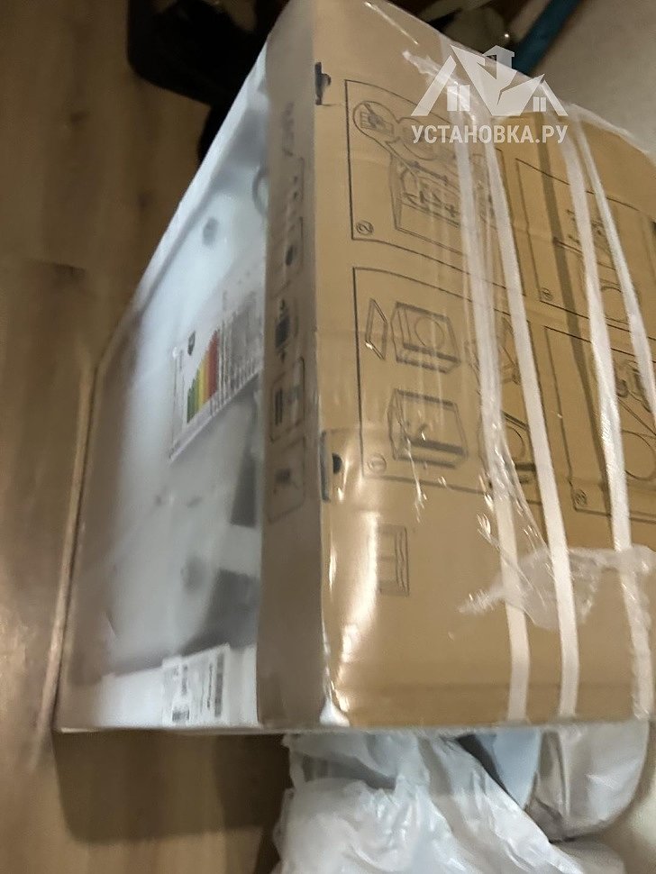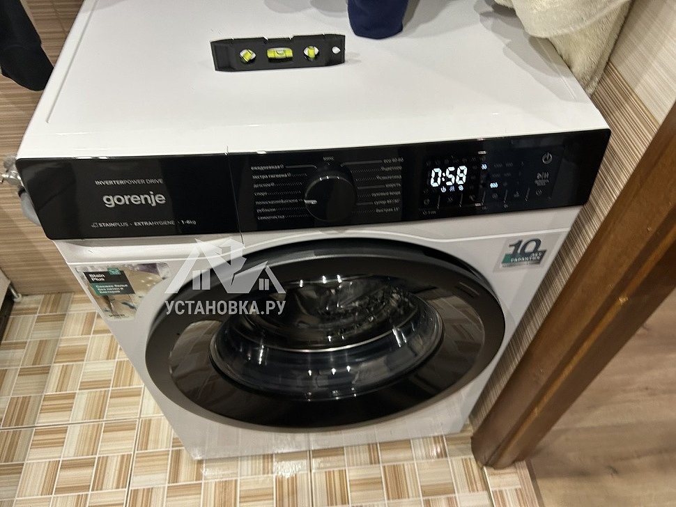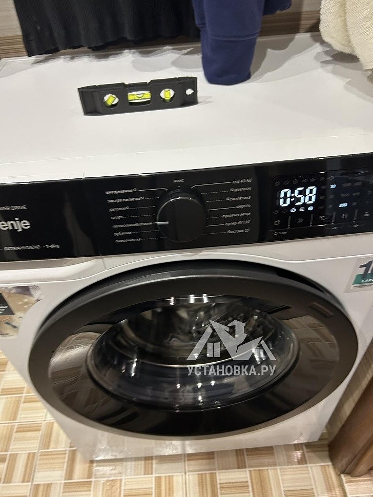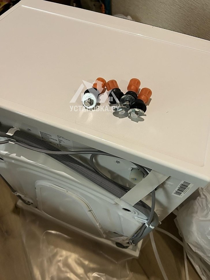 - Снятие транспортировочных креплений у стиральной машины, выравнивание по уровню.