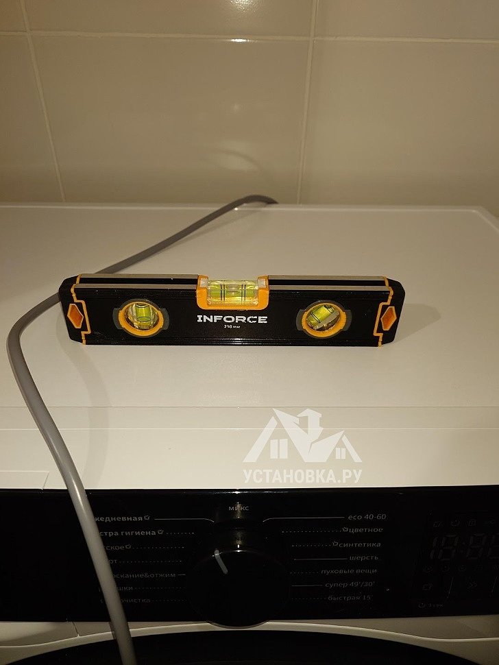 - Снятие транспортировочных креплений у стиральной машины, выравнивание по уровню.