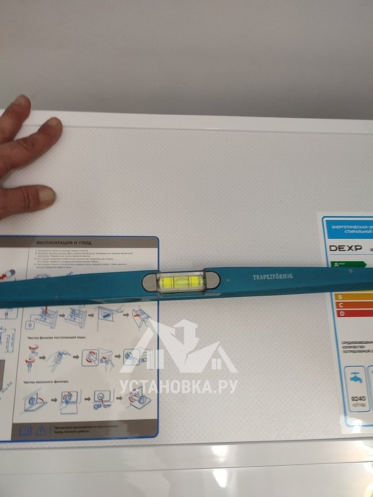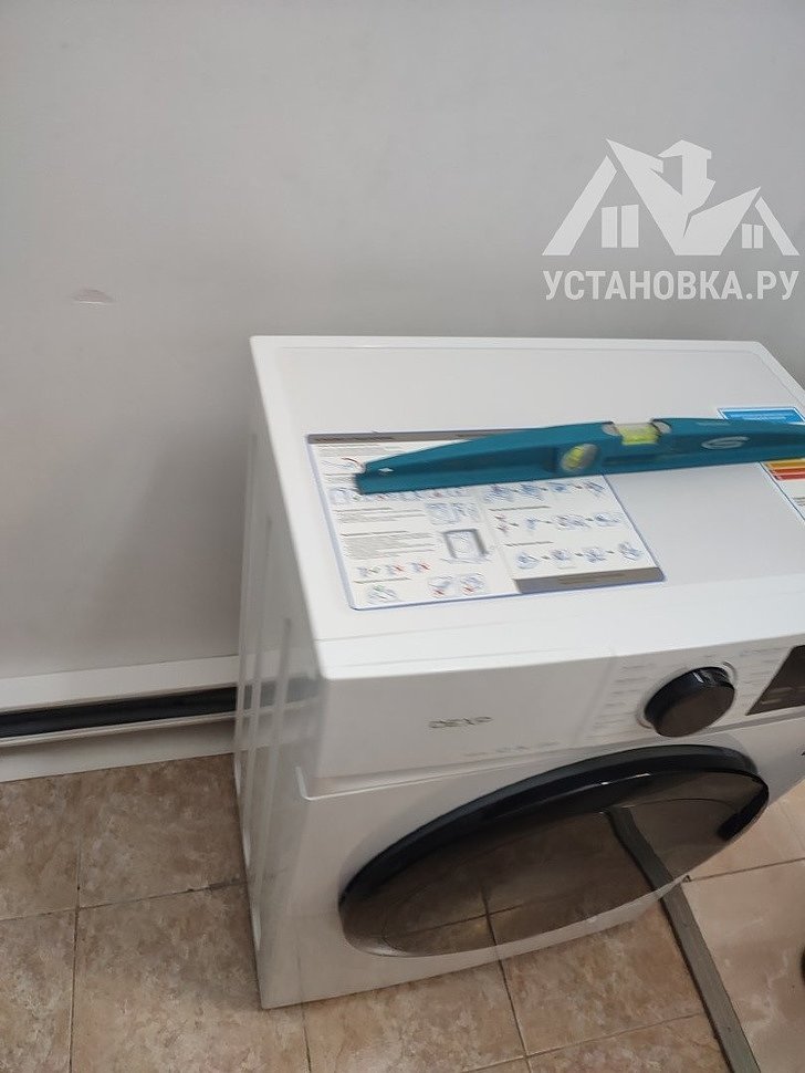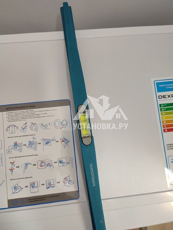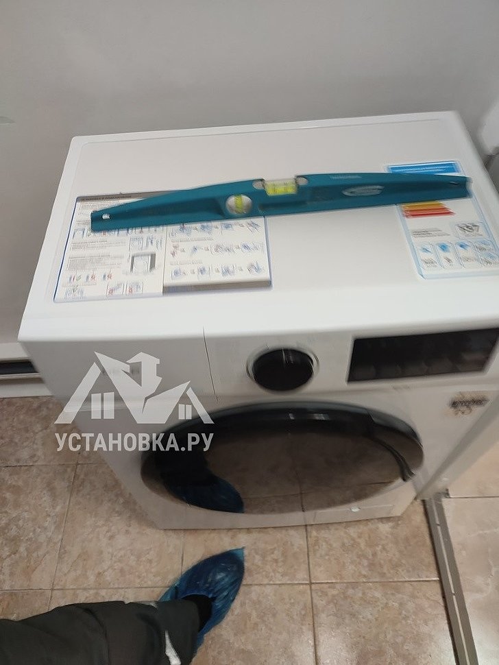 - Снятие транспортировочных креплений у стиральной машины, выравнивание по уровню.
