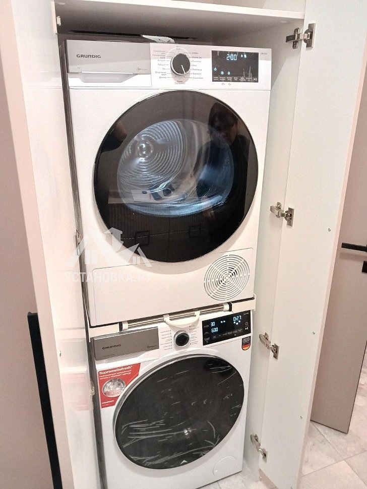 Примечание: Сушильная машина по размерам выглядит как стиралка, её ставят на стиральную машину сверху, из коммуникаций для неё нужна розетка и слив как у стиральной машины, если не делать слив, то в сушильной машине предусмотрен лоток, который позволяет выливать воду без организации слива.