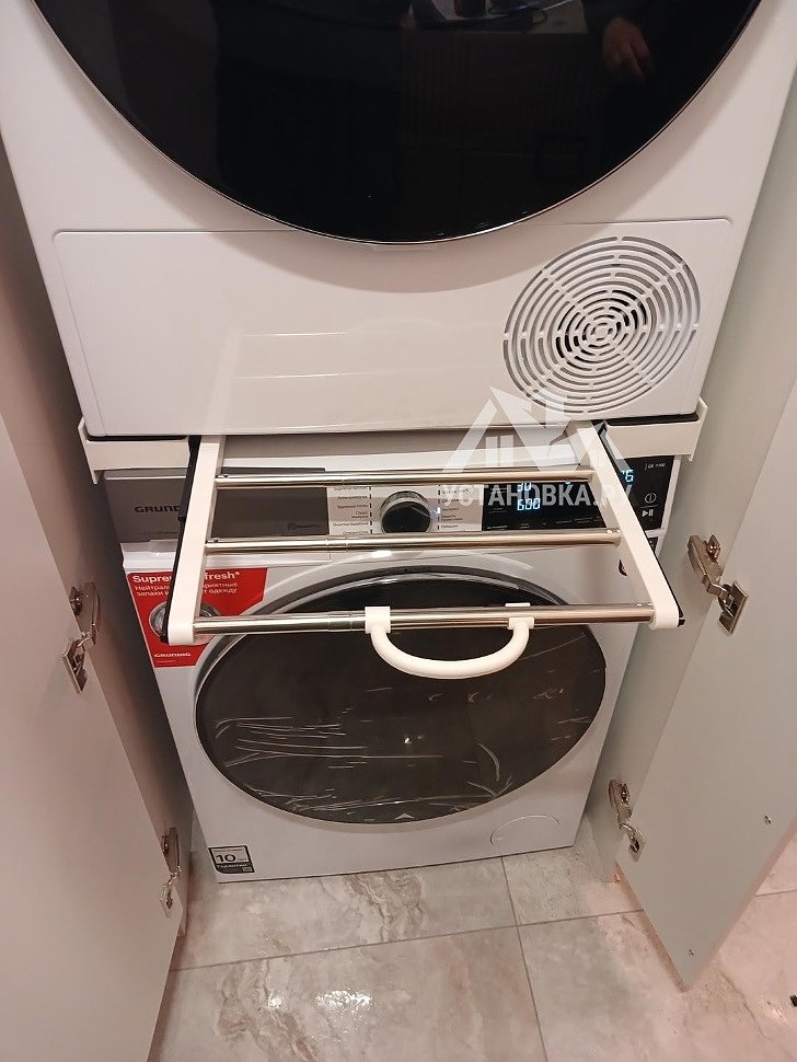 - Установка сушильной машины в колонну (на стиральную машину) при помощи специального крепежа.