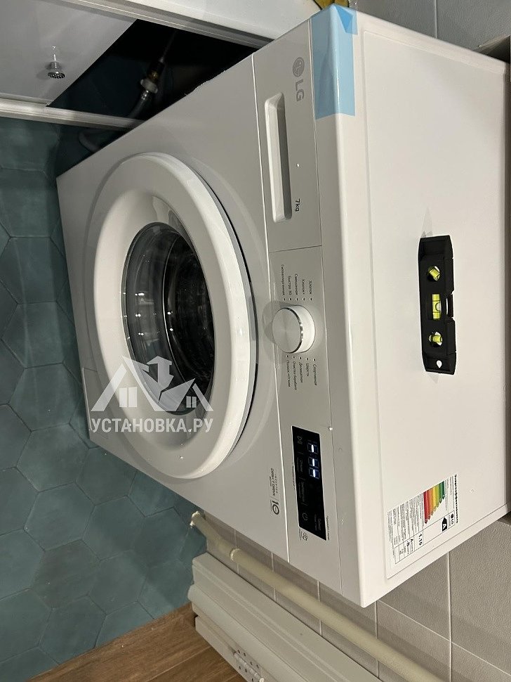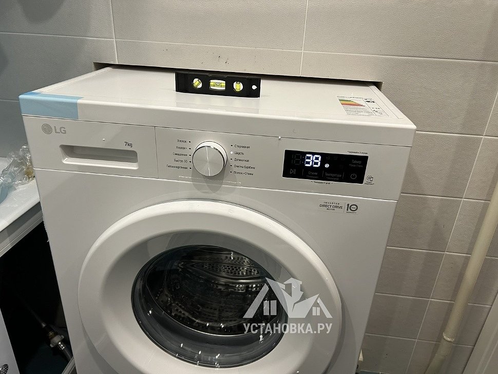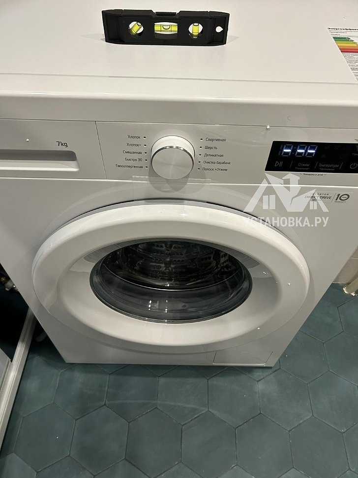 - Снятие транспортировочных креплений у стиральной машины, выравнивание по уровню.