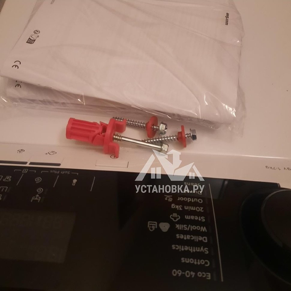 - Снятие транспортировочных креплений у стиральной машины, выравнивание по уровню.