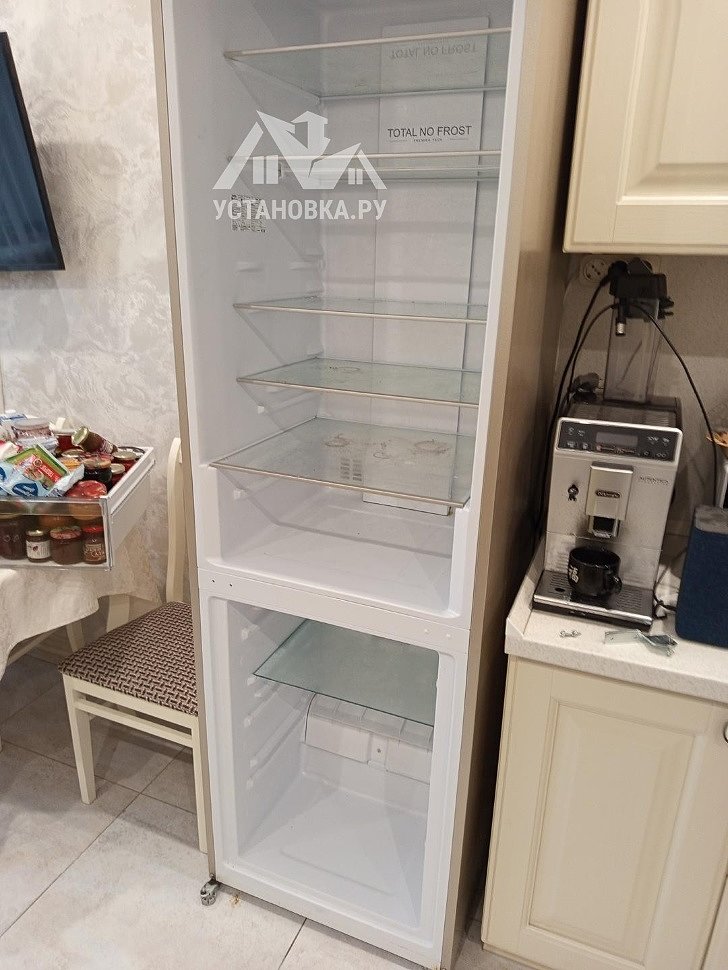 - Демонтаж либо установка нижней полки под холодильник. Для выставления холодильника по высоте.