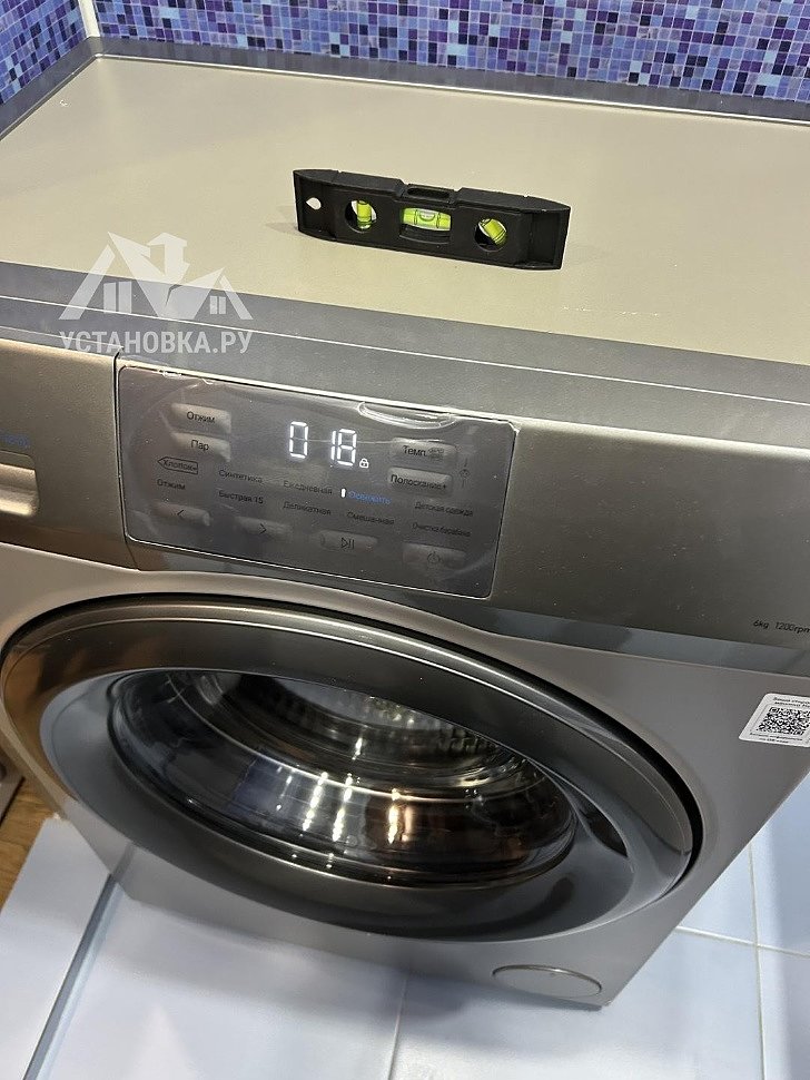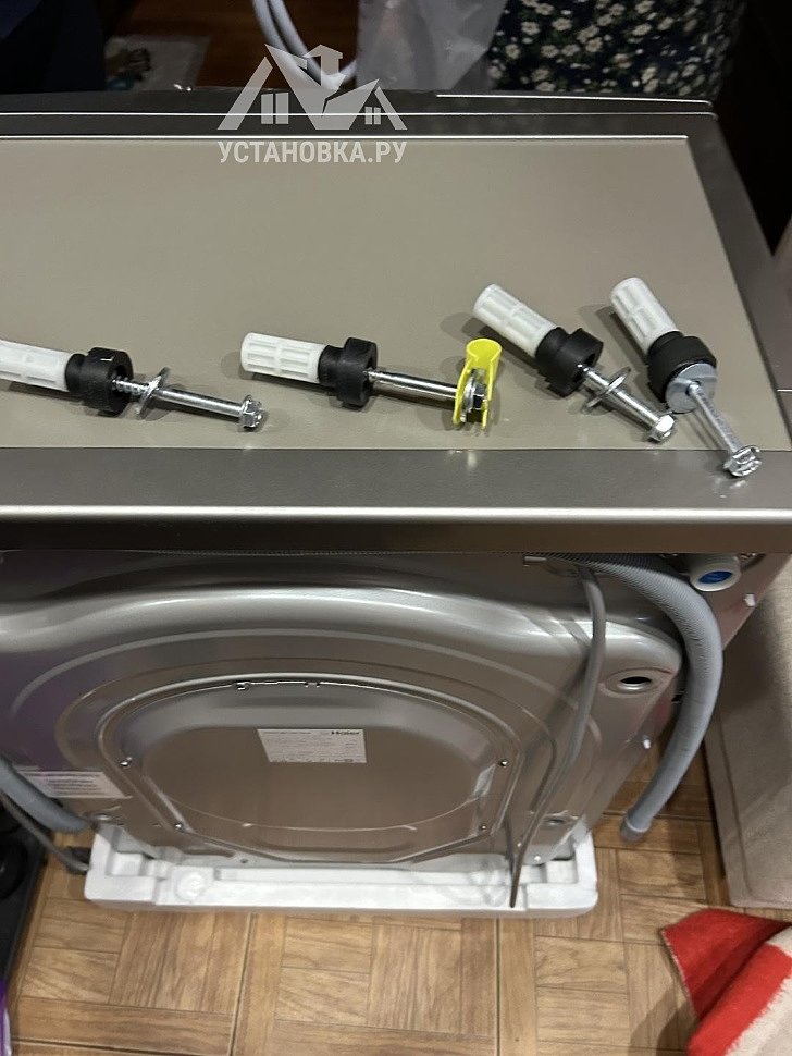 - Снятие транспортировочных креплений у стиральной машины, выравнивание по уровню.