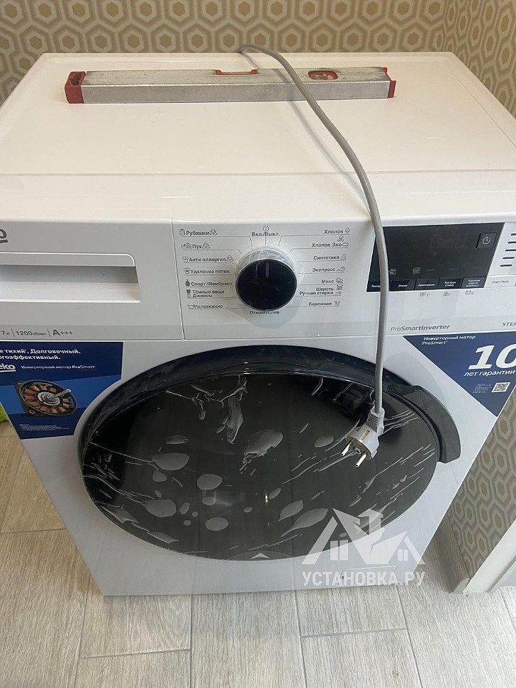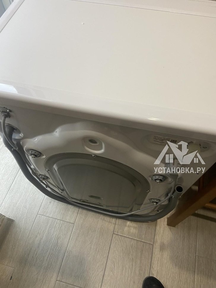- Снятие транспортировочных креплений у стиральной машины, выравнивание по уровню.