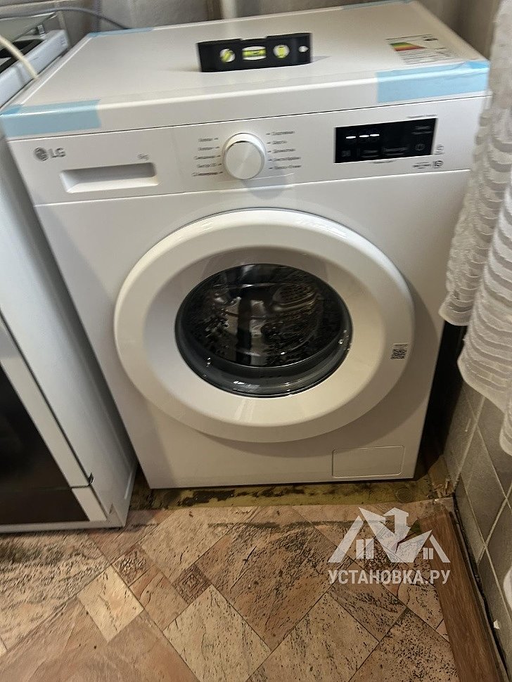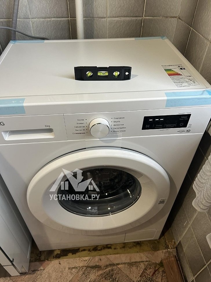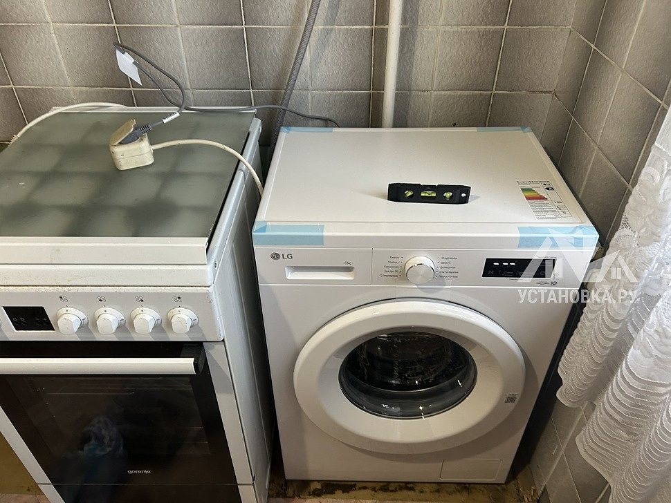 - Снятие транспортировочных креплений у стиральной машины, выравнивание по уровню.