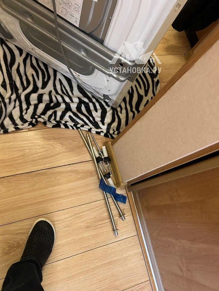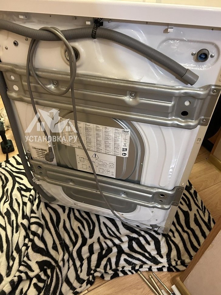 - Снятие транспортировочных креплений у стиральной машины, выравнивание по уровню.