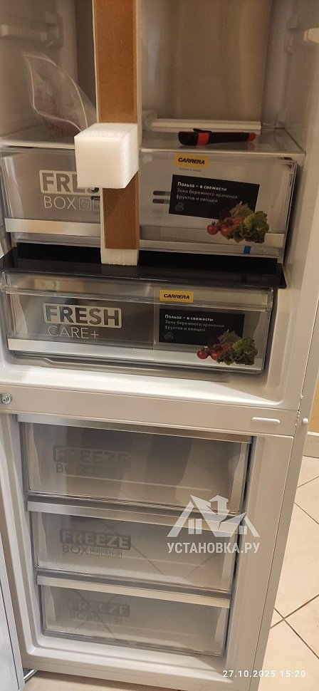 - Демонтаж либо установка нижней полки под холодильник. Для выставления холодильника по высоте.