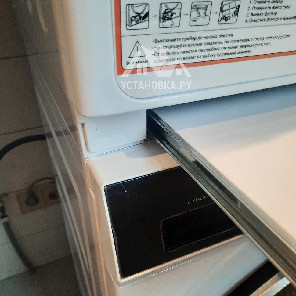 - Установка сушильной машины в колонну (на стиральную машину) при помощи специального крепежа.