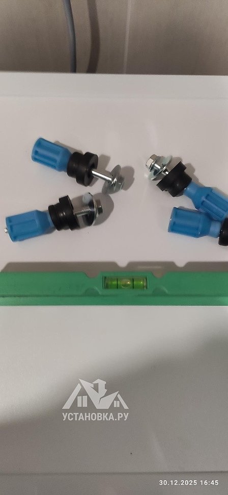 - Снятие транспортировочных креплений у стиральной машины, выравнивание по уровню.